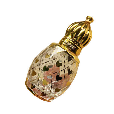 Material: botol kaca kuning muda (perlindungan UV), bagian logam ukiran elektroplating, tutup bentuk mahkota emas